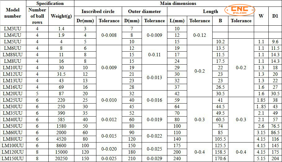 LM3UU, LM4UU, LM5UU, LM6UU, LM8UU, LM10UU, LM12UU, LM13UU, LM16UU, LM20UU, LM25UU, LM30UU, LM35UU, LM40UU, LM50UU, LM60UU, LM80UU, LM100UU