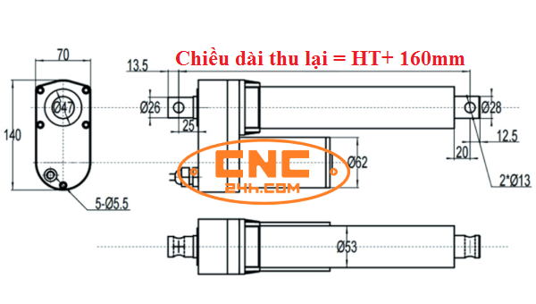 CHIỀU DÀI THU LẠI = 160MM + HÀNH TRÌNH